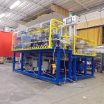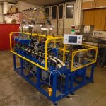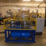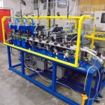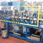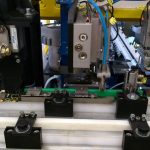 La linea è dotata di due piste, utilizzabili in alternanza, per l’assemblaggio di 4 modelli di chiusure a molla partendo da una matrice stampata.Il ciclo prevede il montaggio della maniglia, della molla e prosegue con la cianfrinatura e il trancio dello scarto, se rilevato, o della bobina alla lunghezza preimpostata.
