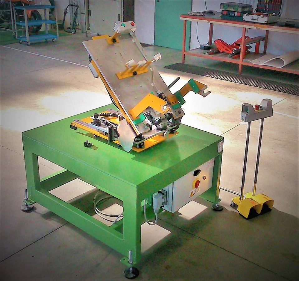Ribaltatore per assemblaggio di attrezzature per la pulizia industriale.L’attrezzatura è stata realizzata per agevolare l’operatore nella fase di assemblaggio; il piano di lavoro può ruotare, traslare verso l’esterno del banco e inclinarsi per agevolare le varie operazioni.