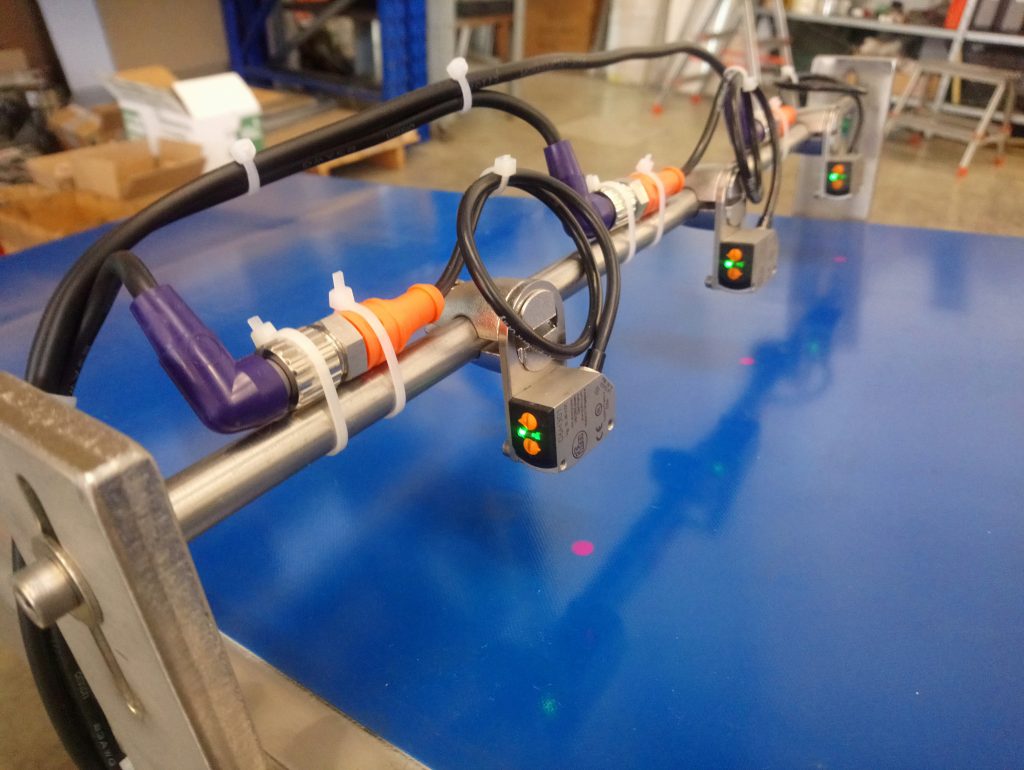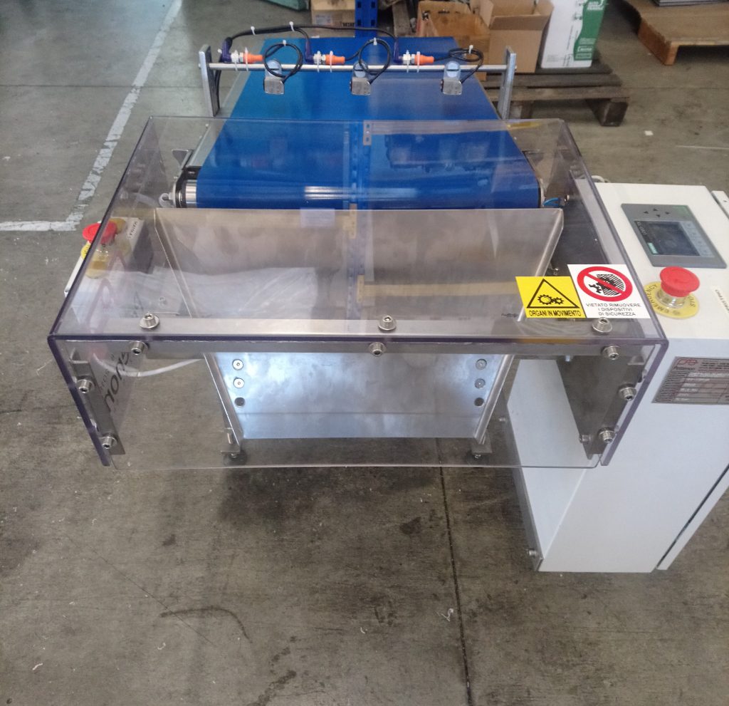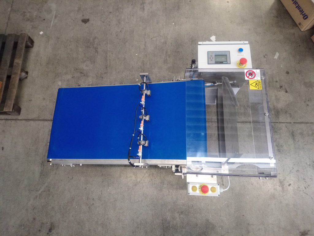 L’attrezzatura è composta da un tappeto per il convogliamento di materiale verso una patella pneumatica che gestisce lo scarico su dei contenitori.Il nastrino è dotato di un sistema per il conteggio dei prodotto in transito. Il ciclo prevede di impostare il numero di articoli per confezione e a quota raggiunta, la patella si sposta per consentire il riempimento del secondo contenitore; un indicatore luminoso segnala il contenitore pieno. La velocità del tappeto è variabile.