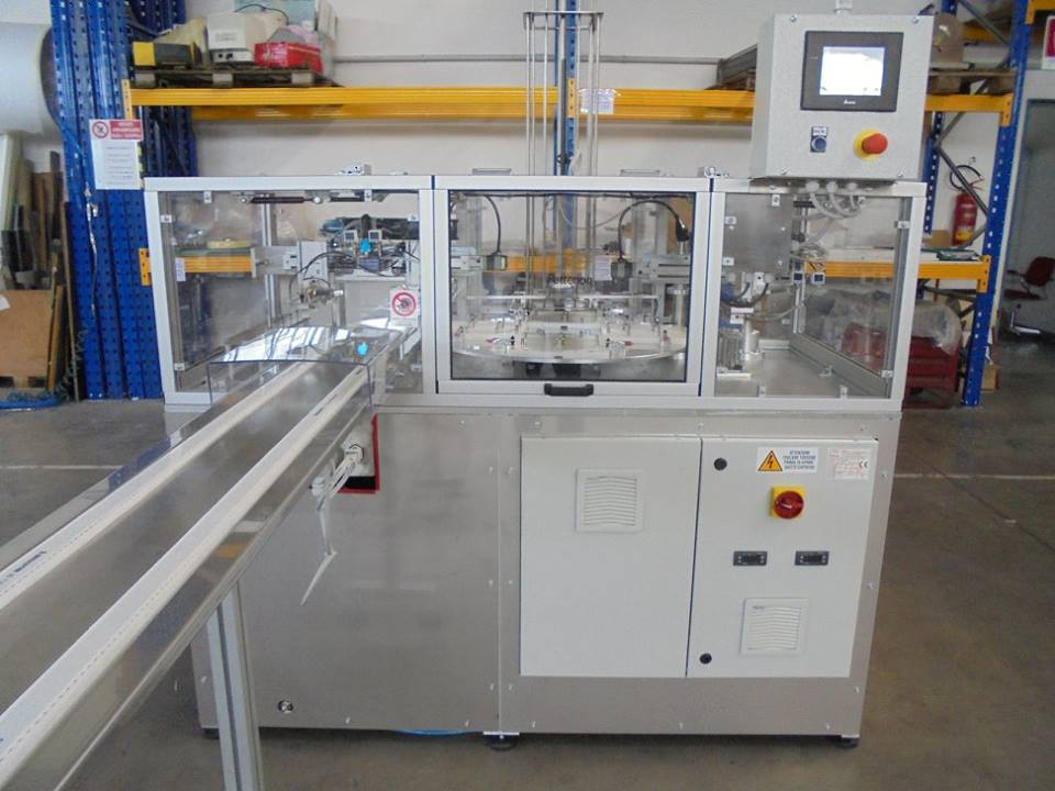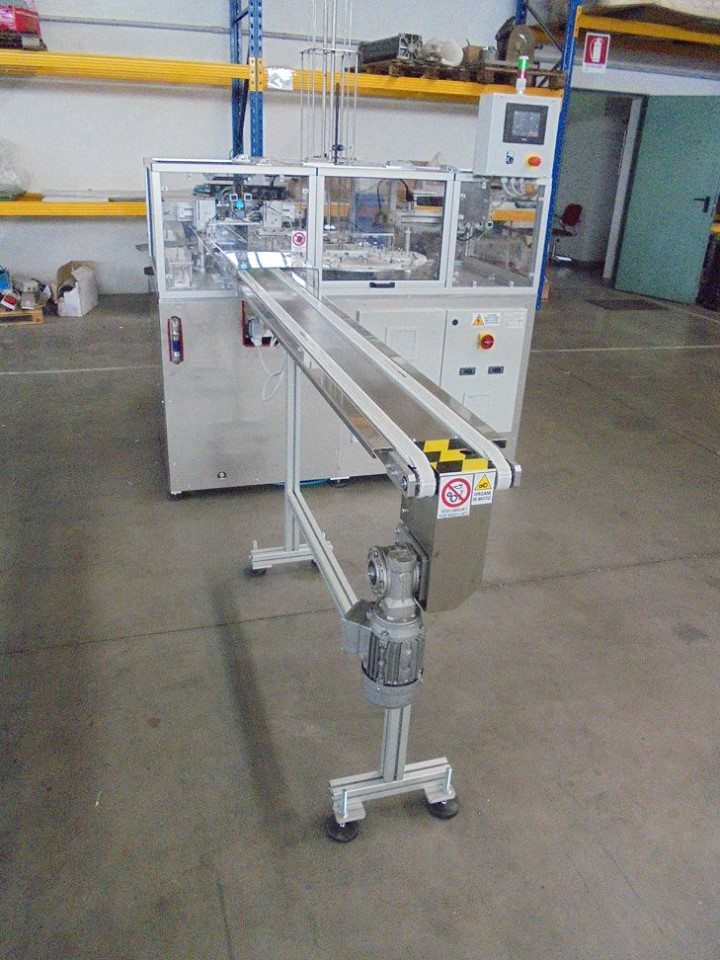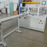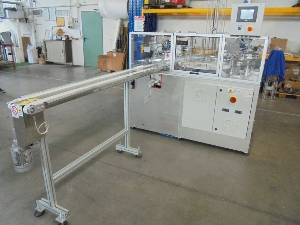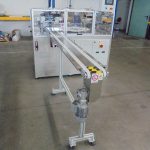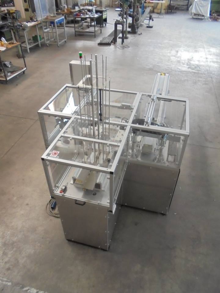 Unità completamente automatica utilizzata per l’applicazione a caldo di etichette identificative su prodotti. Il ciclo inizia con il carico di una coppia di prodotti e si conclude con l’impilamento e lo scarico su un nastro di accumulo.